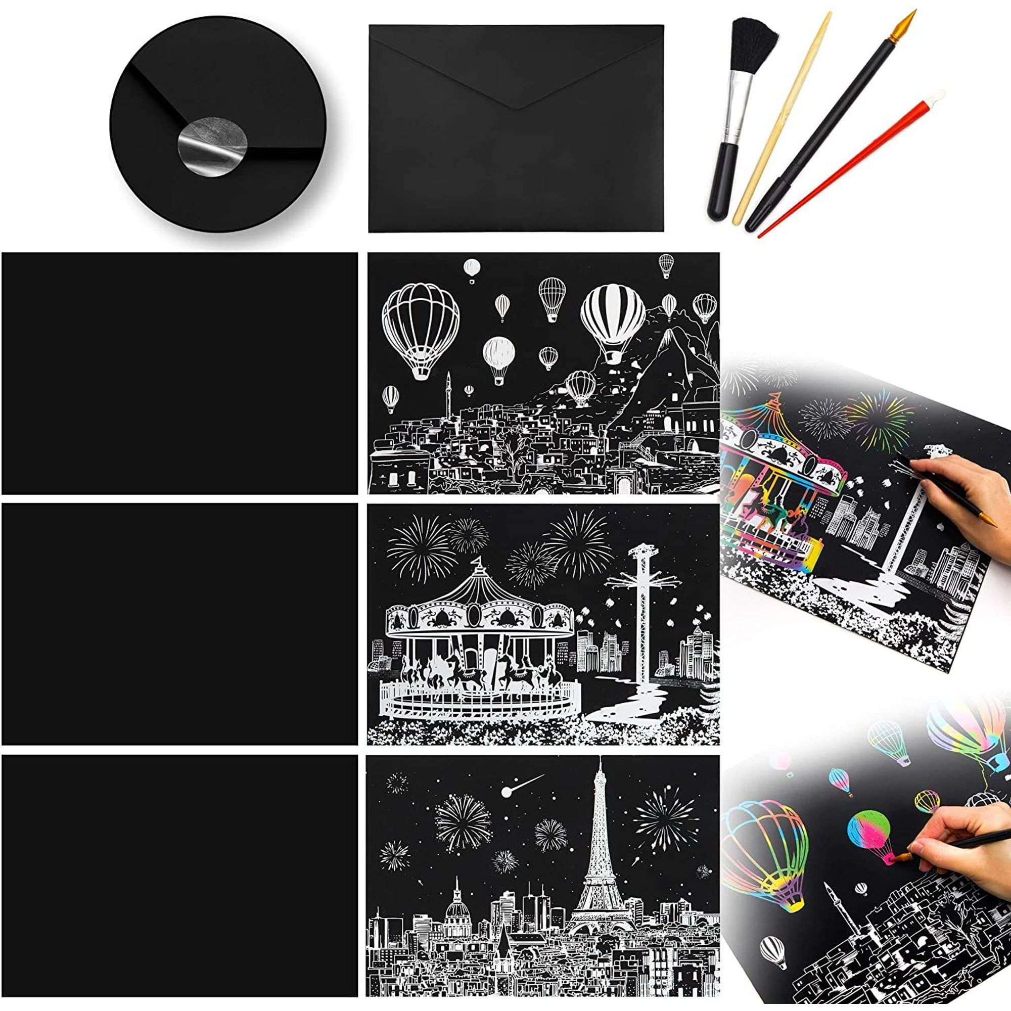 Rainbow scratch painting, handmade scratch paper scratch and sketch paper city night view craft kits with 3 tools (8pack) (american/european style).